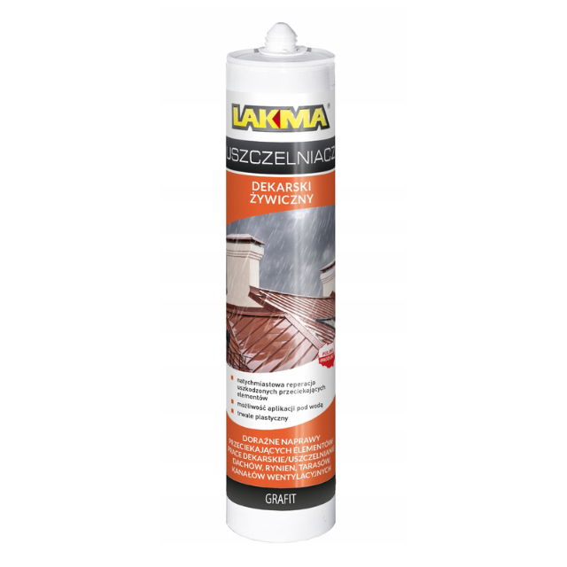 DERVOS PAGRINDU STOGŲ HERMETIKAS – modernus dervos pagrindu sandarinimo hermetikas, pasižymintis labai geru sukibimu su metalo, betono, akmens, medžio, stiklo ir dažų paviršiais. Tai leidžia šį hermetiką naudoti po vandeniu ir smarkaus lietaus metu, nedelsiant pataisyti pažeistus ir nesandarius elementus. Jis yra nuolat plastiškas, todėl galima reguliuoti sujungtus elementus ir apsaugoti nuo vandens nuotėkio eksploatuojant stogo konstrukcijos komponentus. Hermetikas leidžia vertikaliai sandarinti esant iki +80°C temperatūroje. Po sukietėjimo siūlę galima dažyti, ji yra atspari vandeniui ir UV spinduliams. Esant ilgalaikiam sąlyčiui su vandeniu ir veikiant oro sąlygoms sujungimas gali tapti pieniškas, o tai neturi įtakos sujungimo kokybei. TAIKYMAS: Skirtas stogų, terasų, kaminų ir šulinių, lakštinės skardos tvoroms, taip pat pradūrimo vietas per stogus ir terasas, stogams dengtiems bitumine danga sandarinti ir remontuoti. Sandarinimo vietos, kur montuojamos mansardos ir stoglangiai. Sujungimų tarp gofruotų ir trapecinių lakštų, asbestcemenčio plokščių ir bituminių plokščių, taip pat sienų ir rūsių pamatų elementų sujungimų, stogų kompensacinių siūlių užpildymas.
